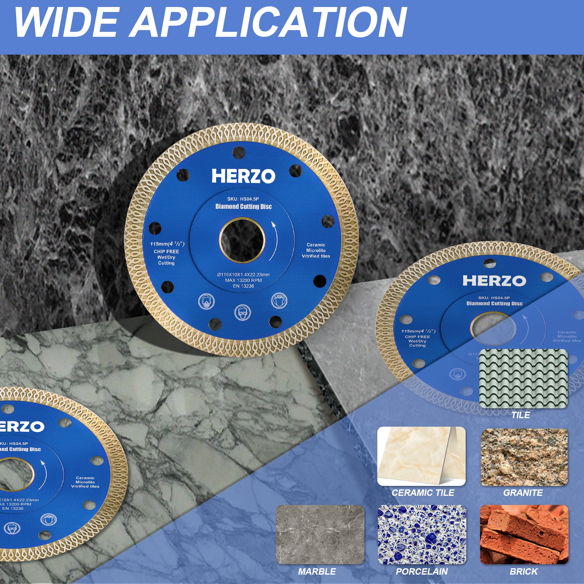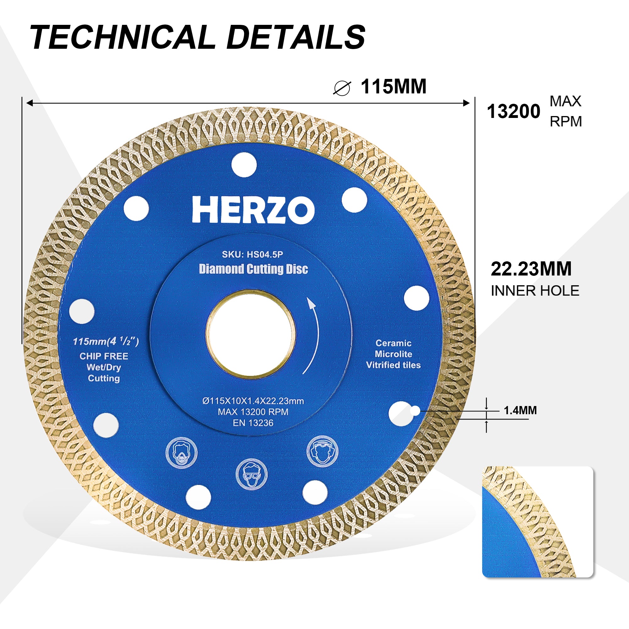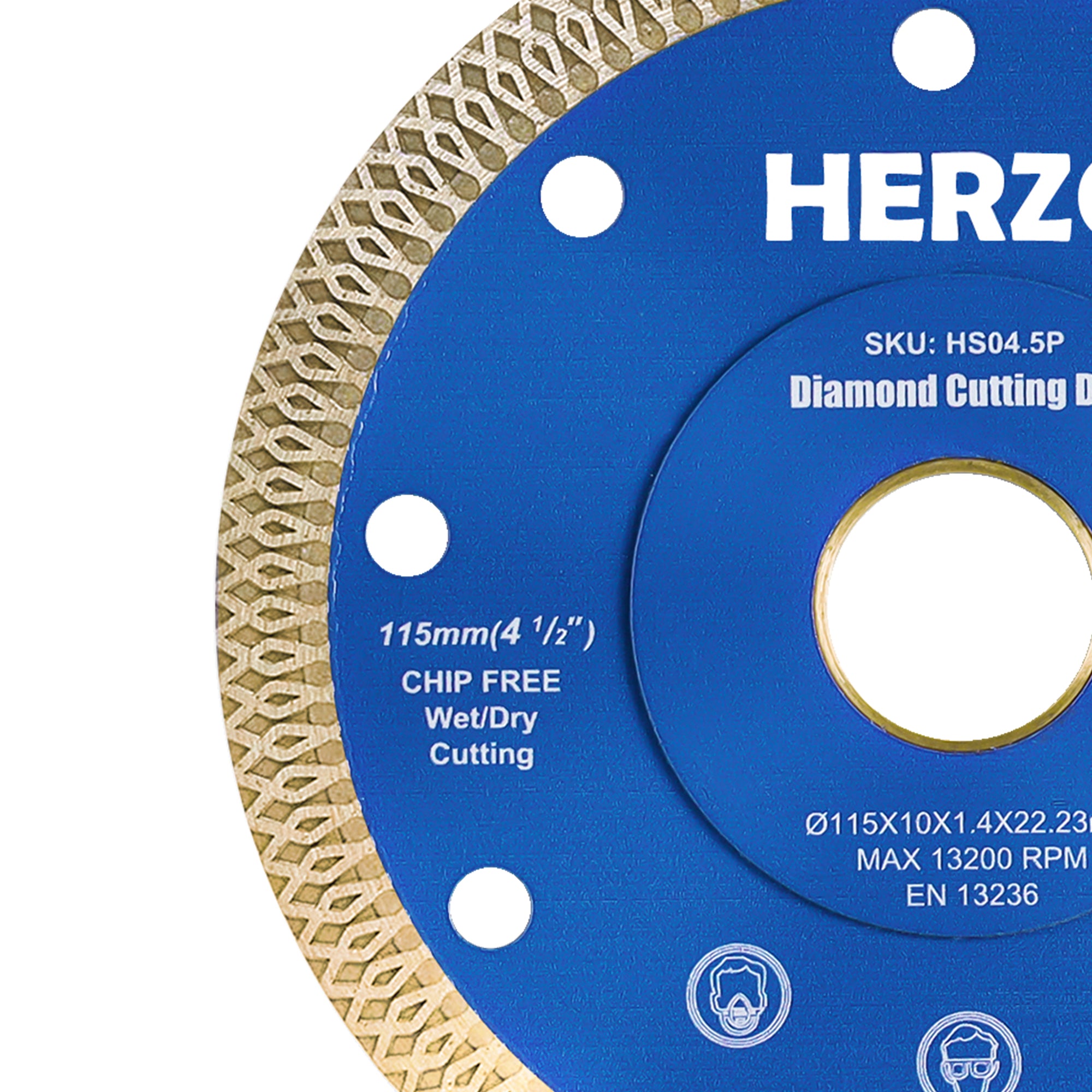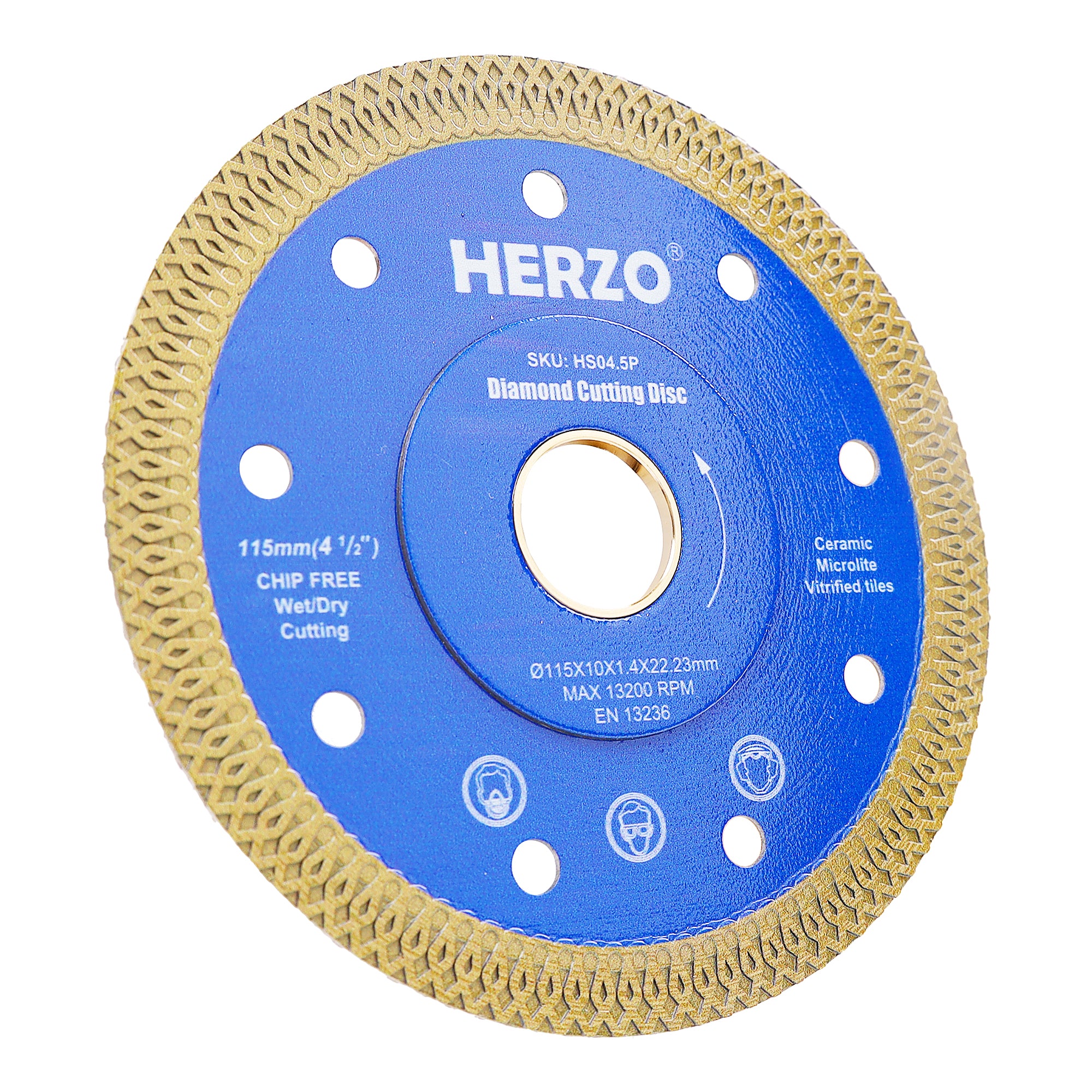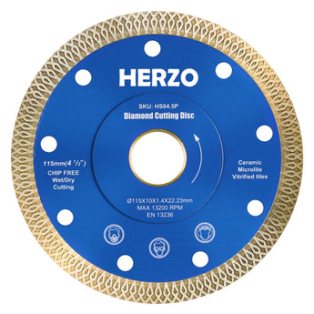 HERZO HSO4.5P Turbo Diamond Blade is tuned for hard materials like tile, granite and light concrete. The turbo rim delivers faster feed with cleaner edges, while laser‑welded segments improve heat resistance and durability. 115mm diameter with 22.23mm arbor fits common grinders and compact saws; supports both wet and dry cutting.